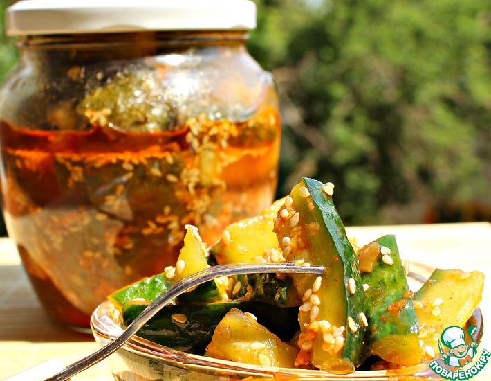 - Огурцы моем, обтираем, отрезаем кончики и разрезаем на брусочки толщиной 5 мм и длиной до 2.5 см. Складываем в емкость. Добавляем в огурцы соль, перемешиваем и оставляем минимум на 40 минут - у меня стояли 1 час, иногда перемешиваем. Отжать как следует огурцы и убрать в другую емкость. Кунжут обжарить на сухой сковороде. Чеснок очистить и выдавить в огурцы. Растереть перец чили или нарезать тонюсенькими колечками и добавить к огурцам, всыпать кунжут и паприку, добавить соевый соус и сахар, влить эссенцию, перемешать деревянной ложкой - откорректировать на свой вкус. Масло прокалить и СРАЗУ влить в огурцы, перемешать. Если хотите полакомиться огурчиками сейчас - отложите часть сразу без стерилизации - просто уберите в холодильник. Остальные огурцы разложить в простерилизованные банки, прикрыть крышками и стерилизовать с момента закипания банки вместительностью 0.5 л 30 минут. Закатать крышки. Хранить в подвале или кладовке. Делала из 1.5 кг огурцов - выход 1.5 литра плюс немного на вечернюю пробу)