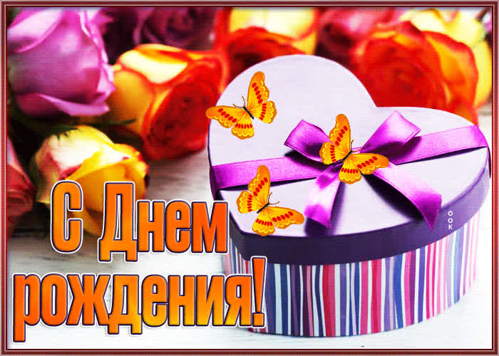 Очаровательная картинка с днем рождения женщине с бабочками и подарком - скачать бесплатно. Прикольная анимационная открытка Очаровательная картинка с днем рождения женщине с бабочками и подарком - отправить прямо сейчас.