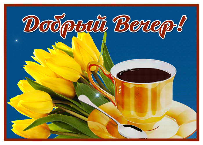 Открытка добрый вечер с желтыми тюльпанами и кофе