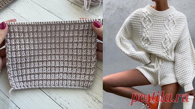 Простой рельефный и эластичный узор спицами для стильного джемпера. В раппорте 2 петли и 4 ряда.