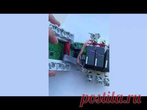 На изображении представлено устройство, связанное с электроникой или электротехническим оборудованием. В центре внимания - внутренняя часть устройства с зелёной печатной платой, на которой видны электронные компоненты и несколько проводов красного и серого цвета. С одного края устройства заметны металлические контакты и крепежи, которые служат для соединения с другими элементами системы. Рядом можно увидеть руку, удерживающую устройство, что свидетельствует о процессе демонстрации или сборки. Фон изображения нейтральный, белый, возможно, это поверхность стола или другой рабочей зоны. Это создает деловую и техническую атмосферу. Компоновка изображения четко фокусируется на деталях внутренней структуры устройства, подчеркивая его функциональные и технические аспекты.