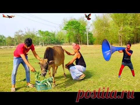 На изображении представлена сельская сцена, где два человека взаимодействуют с коровой. Один человек в красной футболке и джинсах стоит слева и держит в руках зеленые листья, которые, вероятно, служат кормом для коровы. Другой человек в черной майке и розовом тюрбане присел рядом с коровой и трогает её спину, возможно, проверяя состояние здоровья или успокаивая её. На переднем плане справа мужчина в синей футболке и красных брюках держит большую синюю трубу, возможно, создавая комический эффект. На заднем плане виден зелёный лес и светлое небо, придающее сцене ощущение спокойствия и сельской идиллии. В небе летит маленький самолёт, и рядом с ним находится птица, что добавляет ощущение движения и жизни к сцене. Изображение содержит элементы юмора и непринужденности, вероятно, вытекающие из контекста шутливого видео. Атмосфера кажется лёгкой и забавной, создавая беззаботное настроение.