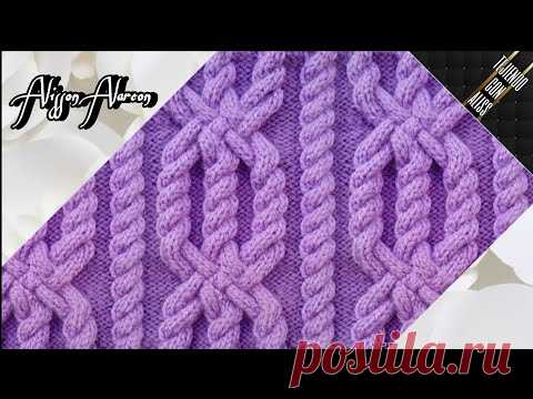 На изображении представлена детальная схема вязания узора спицами, выполненная в оттенках фиолетового цвета. Дизайн включает в себя сложные плетения и переплетения, создающие впечатление объёмных косичек, дополненных центральной линией, образующей перекрестия. Фон выполнен в базовом сетчатом стиле, что подчёркивает плотность и текстуру основного узора. В верхнем левом углу изображены декоративные элементы, которые добавляют визуальный интерес. В правом верхнем углу размещено название вязаного узора и имя автора Alisson Alvarez, что указывает на оригинальность и авторство работы. В нижней части изображения логотип постила.ru, свидетельствующий о месте публикации. Общая композиция выполнена в пастельной гамме, предавая изделию эффект мягкости и нежности.