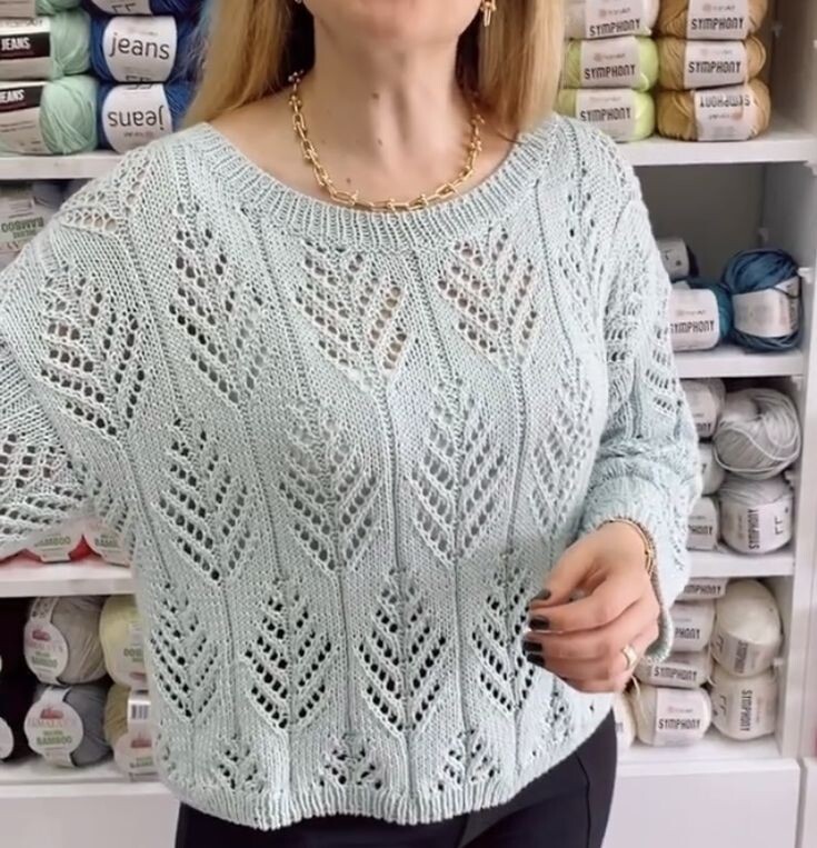 На изображении представлена женщина, демонстрирующая стильный вязаный свитер светло-голубого оттенка, декорированный узором в виде листьев. Свитер имеет свободный крой и длинные рукава, а его текстура подчеркивает мастерство вязальщицы. На фоне видно множество мотков пряжи различных брендов, среди которых можно заметить "Jeans" и "Stappfort". Женщина носит золотую цепочку на шее и серьги, добавляющие изящность её образу. Её ногти аккуратно окрашены в черный цвет, что контрастирует с нежным оттенком свитера. Обстановка вокруг предполагает, что она находится в магазине или студии, связанной с рукоделием. Светлана Лосева, возможно, упоминается в тексте вокруг, как связанный с этой деятельностью человек.