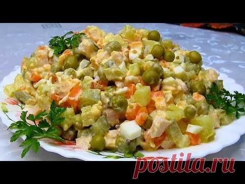 На изображении предстает традиционный салат Оливье, богато украшенный и заботливо выложенный на белой тарелке с цветочным орнаментом. Ингредиенты крупно нарезаны и гармонично смешаны. Среди них выделяются зеленый горошек, кубики моркови оранжевого цвета, нежные кусочки вареного картофеля и яиц. Салат выглядит аппетитно благодаря легкому майонезному покрытию, которое придает ему мягкий блеск. Подается он с веточками сочной свежей зелени, что добавляет композиции яркости и свежего аромата. Фон изображения приглушенный, что акцентирует внимание на салате, а надпись "удивительно новый вкус привычного салата" усиливает интригу и интерес к данному блюду.