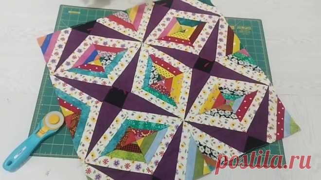 На изображении представлен лоскутный блок, который лежит на зеленом коврике для резки. Блок состоит из восьми треугольников, которые объединяются в яркий и сложный узор. Каждый треугольник содержит множество разноцветных тканей, включая красные, желтые, синие и зеленые полосы, а также элементы с цветочными и геометрическими принтами. Контрастные фиолетовые границы делают узор более выразительным. Справа от блока находится роторный резак с желтым лезвием и голубой ручкой. На заднем плане видна текстура деревянного пола, что создает уютную атмосферу творческого пространства. В нижнем правом углу изображен водяной знак сайта postila.ru, который служит намеком на источник материала. Эта композиция показывает творчество и креативный подход в лоскутном шитье, вдохновляя на создание уникальных изделий.