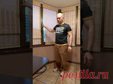 На изображении представлен мужчина средних лет в помещении, стоящий у окна с жалюзи. Он одет в черную футболку с надписью на русском языке и коричневые брюки. Мужчина держит одну руку поднятой, касаясь оконной рамы. В комнате светло, стены окрашены в светло-бежевый цвет, а пол покрыт плиткой. На заднем плане видны несколько больших окон с узкими жалюзи, которые пропускают немного света. Поза и выражение лица человека указывают на то, что он что-то объясняет или демонстрирует. На запястье у него черные часы. В левом нижнем углу можно заметить часть темного стола, добавляющего текстуру интерьеру. Атмосфера на фото кажется сосредоточенной и деловой, возможно, связано с обсуждением каких-либо вопросов ремонта или оценкой интерьера.