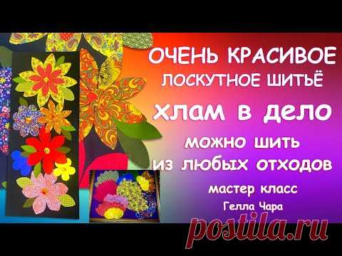 Эта иллюстрация представляет собой яркую и красочную композицию, посвящённую теме лоскутного шитья. На фоне плавного градиента от розового к оранжевому и фиолетовому белыми и жёлтыми буквами написано: "Очень красивое лоскутное шитьё. Хлам в дело. Можно шить из любых отходов. Мастер класс Гелла Чара". На изображении также присутствуют крупные аппликации цветов разнообразных форм и оттенков — от насыщенно красного до нежно-розового, из которых собраны фигурные композиции. Это визуальное сочетание подчёркивает креативность и выразительность создания прекрасных изделий из различных материалов повторного использования. Под основным элементом, в нижнем левом углу, размещено миниатюрное изображение с аналогичными цветочными мотивами, поддерживающее общую эстетику. В правом нижнем углу можно заметить логотип "postila.ru".