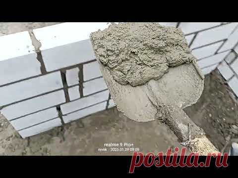 На изображении показан процесс кладки кирпичной стены. На переднем плане находится мастерок с серой цементной смесью. Задний план изображает ряды белых кирпичей, аккуратно уложенных друг на друга с ровными швами. Фон выполнен в светлых тонах, создавая атмосферу рабочего процесса. Также видна подпись на фото, указывающая на использование смартфона realme 9 Pro+. Контраст между грубоватой текстурой цемента и гладкими кирпичными линиями подчеркивает промышленную эстетику кадра.