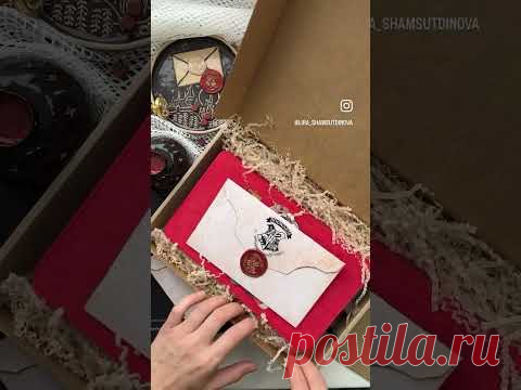 На изображении изображена крафтовая коробка, внутри которой находится стильный конверт. Конверт выполнен из плотной бумаги и украшен гербом Хогвартса, на котором видны детали четырех факультетов. К конверту прикреплена красная восковая печать с отпечатком, добавляющая атмосферу старинного письма. Конверт расположен на красной подложке, которая выделяет его в центре коробки. Вокруг лежит древесная стружка, аккуратно располагающаяся по бокам для создания уютного эффекта упаковки. На заднем фоне изображены элементы тематического декора с новогодним или рождественским мотивом и упакованный круглый предмет с символикой Хогвартса. Декоративные элементы из темного и золотого цветов добавляют изображению праздничную атмосферу. Рядом с коробкой видна рука, касающаяся края, подчеркивая внимание к деталям и ручной сборке подарка.