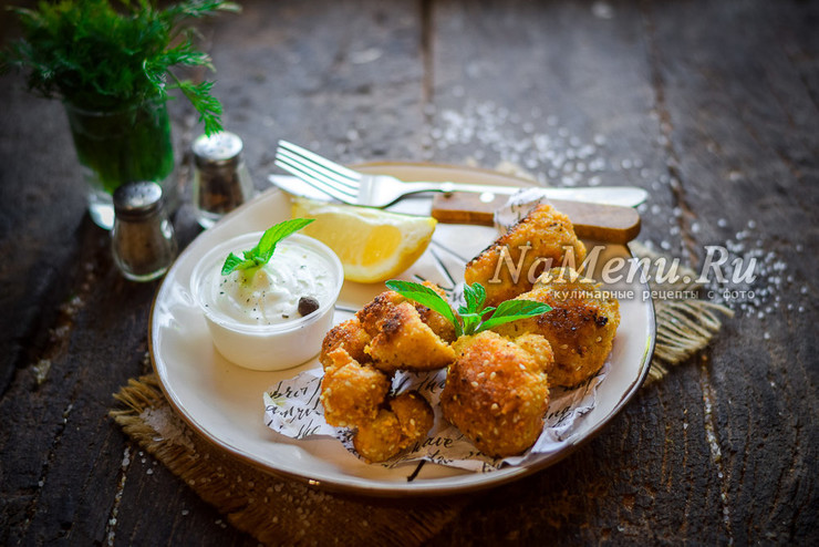 На изображении представлено аппетитное блюдо из цветной капусты, приготовленное в кляре и запечённое в духовке. Капустные соцветия имеют золотисто-коричневую корочку, что свидетельствует о хрустящей текстуре и богатом вкусе. На тарелке, рядом с капустой, находится небольшой соусник с белым соусом, украшенным веточкой свежей зелени. Также на тарелке лежат дольки лимона, добавляющие свежесть и пикантность. Фон изображения выполнен в тёплых, натуральных тонах, создавая атмосферу уюта и спокойствия. На заднем плане можно заметить пучок зелени и солонку с перечницей. Стол, на котором расположена тарелка, имеет тёмную деревянную поверхность, придавая общей композиции деревенский шарм. Изображение также содержит логотип сайта "NaMenu.Ru" и надпись "postila.ru".