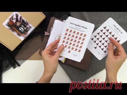 На изображении представлены руки, держащие два листа с наклейками в стиле "Гарри Поттер". На одном из листов видны изображения маленьких персонажей с рыжими волосами, вероятно, Рона Уизли. На другом листе наклейки с изображением сов. На фоне можно увидеть часть коричневого блокнота, а также картонную коробку с иллюстрацией платформы 9 ¾, отсылающей к сценам из фильма "Гарри Поттер". На столе также лежат элементы для скрапбукинга, включая крафт-бумагу и сетку черного цвета. Атмосфера фотографии связана с творческими занятиями, такими как скрапбукинг. В окружении чувствуется уютная и вдохновляющая атмосфера, предназначенная для создания личных рукотворных проектов.
