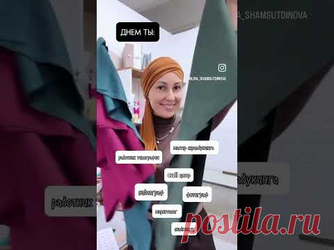 На изображении изображена женщина с дружелюбной улыбкой. Она держит два ярких кусочка ткани, один из которых фуксийного цвета, а другой бирюзового. Женщина носит головной убор светло-оранжевого оттенка и коричневую одежду. Фон представляет собой современное помещение с белыми стенами и полками с книгами. Атмосфера живая и творческая, различные надписи на русском языке размещены на изображении. Освещение естественное, добавляющее уютной атмосфере.