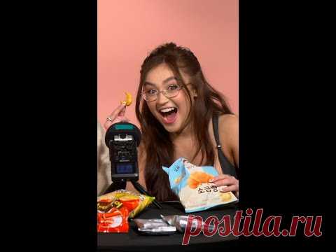 На изображении девушка с длинными каштановыми волосами и круглой оправой для очков. Она улыбается и держит в руках пакетик с закусками. Её выражение лица радостное и оживлённое. На чёрном столе перед ней расположены различные упаковки с закусками и белые полоски, возможно, упаковки для тестовых образцов. За столом стоит микрофон, что может указывать на то, что она снимает видео или записывает звук, возможно, для блога или канала на YouTube. Фон однотонный розовый, добавляющий яркости и создающий тёплую атмосферу кадра. Общее настроение сцены энергичное и дружелюбное, визуальное оформление обращает внимание на акцентирующее использование тёплых оттенков.