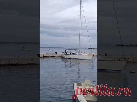 На изображении изображена спокойная гавань с пришвартованной парусной яхтой на переднем плане. Вода в гавани кажется спокойной и отражает сероватое небо, которое укрывает территорию завесой облаков. Небо светло-серое, создающее ощущение прохлады и приближающегося дождя. На заднем плане можно увидеть другие яхты, стоящие вдоль причала, и небольшой участок берега. На переднем плане находится небольшая моторная лодка с бортами белого цвета. Атмосфера изображения вызывает чувство спокойствия и уединения, создавая идеальный фон для размышлений и отдыха. Краски и освещение добавляют сцене свою уникальную меланхолию и спокойствие. Архитектурные элементы на заднем плане, вероятно, принадлежат местным причалам или пирсам, что указывает на использование территории в промышленных или рекреационных целях.