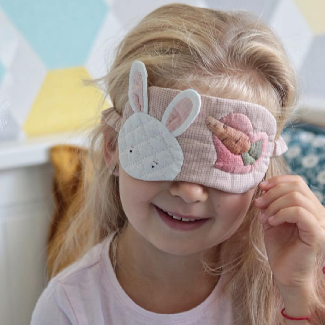 На изображении изображена молодая девочка с длинными светлыми волосами, сидящая с повязкой на глазах. Повязка выполнена в пастельных тонах с изображением кролика и морковки, что придаёт ей милый и игривый вид. Девочка слегка улыбается, создавая ощущение радости и беззаботности. На заднем плане можно заметить размытый фон с элементами интерьера, такими как мягкая подушка c узором и стена с разноцветными геометрическими фигурами. Это создаёт уютную и домашнюю атмосферу. Девочка одета в простую светлую футболку. Свет падает мягко, подчеркивая безмятежность сцены и создавая тёплую атмосферу.