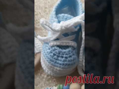 На изображении показаны маленькие вязаные ботиночки нежно-голубого цвета. Они выполнены в стиле кроссовок с белыми шнурками, что придаёт им ещё больше очарования. Верхняя часть обуви имеет нежные бело-голубые полоски, создающие аккуратный и мягкий визуальный эффект. Подошва этих ботиночек также выполнена из вязки и поддерживает общую цветовую схему изделия. Весь дизайн выдает качественную ручную работу, что особенно важно для детских вещей. На переднем плане видна плетеная игрушка или подвеска, детали которой включают цветные элементы из светло-голубого, белого и зеленого цветов. Она добавляет объекту дополнительную атмосферу уюта и нежности. Фон изображения нейтрален, предполагая, что ботиночки лежат на мягкой текстуре, возможно ковре или другом покрытии, придающем всему образу домашний характер. Изображение настраивает на теплое и спокойное настроение, создавая атмосферу заботы и нежности, типичную для детских изделий.