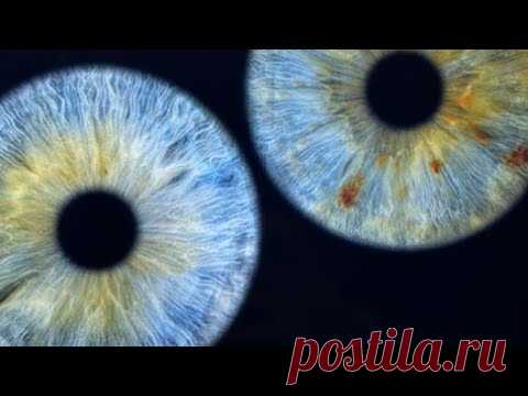 На изображении представлены два крупных снимка радужки глаза, расположенные на черном фоне. Левая радужка имеет яркие оттенки синего, с ярко выраженной текстурой, подобной тонким линиям или прожилкам, которые создают сложный рисунок, напоминающий полосы или волны. В центре радужки находится темная область зрачка, которая контрастирует с окружающей светлой тканью. Правая радужка также преимущественно синяя, но содержит уникальные оттенки зелёного и жёлтого, с дополнительными вкраплениями коричневых пятен, которые добавляют глубину изображению. Этот снимок показывает четкие и конкретные детали текстуры глаза, позволяя зрителю ощутить близость и изучение мелких особенностей человеческого глаза. Черный фон усиливает контраст, подчеркивая яркость и уникальность изображения. Изображение создаёт ощущение объема и глубины, акцентируя внимание на загадочной и сложной природе человеческого глаза.