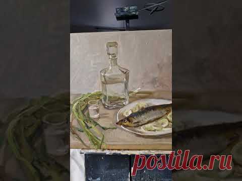 На изображении представлена картина в стиле классического натюрморта. На переднем плане расположен стол, на котором лежит тарелка с рыбой, возможно это селедка, на окружении луковых колец. Рядом стоит прозрачный графин с прозрачной жидкостью, вероятно, это вода или алкоголь. У стола также есть маленькая стопка, намекающая на сцену застолья. Слева от графина кучка зеленого лука. Фон картины нейтральный, что позволяет сосредоточить внимание на композиции самого стола. Картина выполнена в спокойных и мягких тонах, создавая уютную и непринужденную атмосферу. Изображен реалистичный подход в передаче текстур и материалов, таких как гладкость стекла и текстура рыбы. Детали переданы с вниманием, что может указывать на умение художника работать со светом и тенью, создавая глубину и объем. Этот натюрморт может ассоциироваться с традиционной русской кухней и культурой застолья.