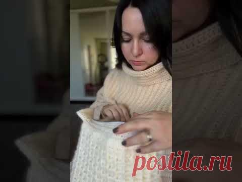На изображении представлена женщина в крупно вязаном свитере кремового цвета. Она сосредоточенно смотрит на ткань, которую держит в руках. Её волосы темные и распущены, спадая на плечи. Атмосфера фотографии спокойная и домашняя благодаря приглушенному освещению. Фон размытый, но можно заметить элементы интерьера, что может быть комнатой или рабочим пространством. Все детали образы и окружения создают ощущение уюта.