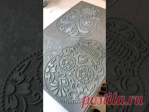 На изображении представлена плитка или поверхность тёмно-серого цвета с детализированным рельефным узором. Узор содержит стилизованные элементы в виде черепов, характерные для праздника Día de los Muertos, с декоративными цветами, сердечками и извилистыми линиями. Рельефное исполнение создаёт впечатление глубины и добавляет трёхмерности дизайну. Общий тон спокойный, гармонично сочетающий современные элементы декора с традиционными мотивами, создавая уникальный и привлекательный вид. Поверхность выложена на ровной светлой поверхности, возможно, на полу или столе рабочего пространства, что указывает на стадию производства или показа готового изделия.