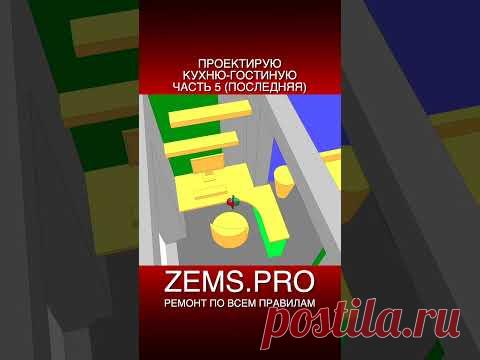 На изображении представлен дизайн-проект кухонно-гостиной, выполненный в минималистичном стиле с использованием ярких цветов. Основные цвета, используемые в проекте, включают желтый и синий для выделения зон и элементов интерьера. В центре внимания стол и барная стойка, гармонично сочетающиеся друг с другом. Светлые серые оттенки стен создают контраст, подчеркивая яркость мебели. Заголовок в верхней части изображения гласит: "Проектирую кухню-гостиную часть 5 (последняя)", что указывает на завершение серии проектов. В нижней части размещена информация о сайте "ZEMS.PRO" с подписью "ремонт по всем правилам". Буквы выполнены в белом цвете на красном фоне, что делает их заметными и привлекает внимание. Данный проект предполагает использование открытых пространств и простых форм для создания современного и функционального интерьера.
