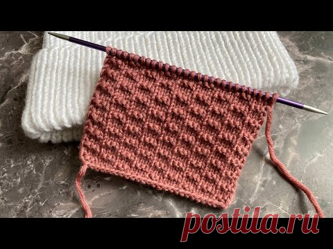 На изображении представлен образец вязания на фоне мраморной поверхности. В центре находится небольшой прямоугольник, связанный узором «теневой». Этот узор выполнен из пряжи теплого розового оттенка и закреплен на спицах из металла, которые имеют фиолетовый оттенок. На заднем плане лежит белый вязаный изделие, предположительно шарф или свитер, который добавляет контраст к основной работе. Вязальный узор выглядит плотно и аккуратно, охватывая весь небольшой образец. В нижнем правом углу видна водяная марка с надписью "postila.ru". Атмосфера создает ощущение уюта и сосредоточенности на процессе ручной работы, что отражает идею "Простой теневой узор для базовых вещей", упомянутую в сопровождающем тексте.