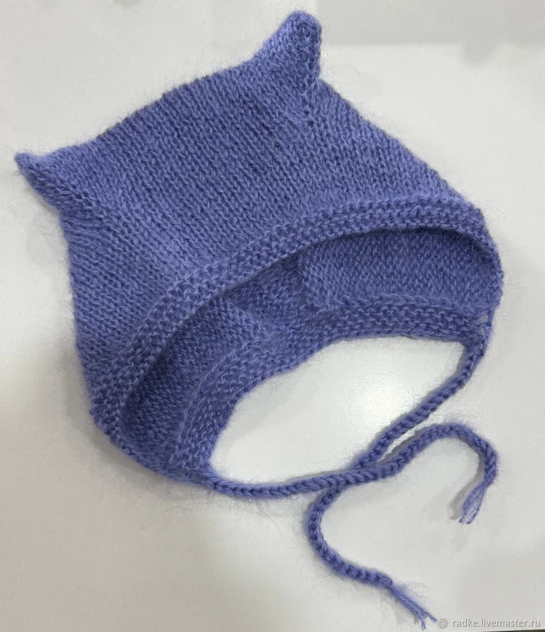 На изображении представлен вязаный чепчик сиреневого цвета. Чепчик оснащён милыми ушками, что придаёт ему игривый и стильный вид. Он выполнен из мягкой пряжи, что позволяет обеспечить комфорт и тепло в холодное время года. Вязка достаточно плотная и качественная, что заметно на деталях изделия. Завязки позволяют фиксировать чепчик под подбородком, добавляя удобства в использовании. Фон изображения однородный и светлый, что подчеркивает цвет и текстуру самого чепчика. Этот аксессуар способен добавить индивидуальности и игривости в образ, выделяясь на фоне повседневных головных уборов.