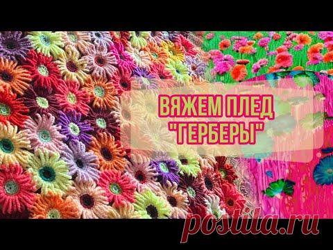 На изображении представлено вязание крючком, создающее привлекательный плед, украшенный мотивом "Герберы". Узоры пледа выполнены в ярких и насыщенных цветах: красный, оранжевый, зелёный, голубой и розовый, которые складываются в узор, напоминающий цветы. Эти цветочные узоры отличаются сложной вязкой и разнообразием оттенков, что создаёт ощущение веселья и свежести. На переднем плане можно увидеть афишу с текстом на русском языке, свидетельствующую о процессе вязания. Фон составляют более абстрактные формы, которые удерживают внимание на главной части композиции. Присутствие сайта "postila.ru" в правом нижнем углу указывает на источник контента или его создателя.