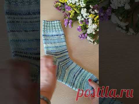 На изображении видно, как пара женских рук аккуратно держит вязаный носок ярко-голубого цвета с темно-синими и светло-синими полосками. Руки выглядят ухоженными, ногти покрашены в красный цвет. Вокруг носка расположены цветы: белые, фиолетовые и желтые, которые создают атмосферу весны и свежести. Носок изготовлен из высококачественной пряжи, что свидетельствует о тщательности работы. Фоном служит светлая деревянная поверхность, на которой хорошо видны детали вязки. Снимок создает уютное и домашнее впечатление, указывая на мастерство и любовь к ручной работе. Вероятно, носок изготовлен из пряжи компаний, упомянутых в тексте рядом с изображением.