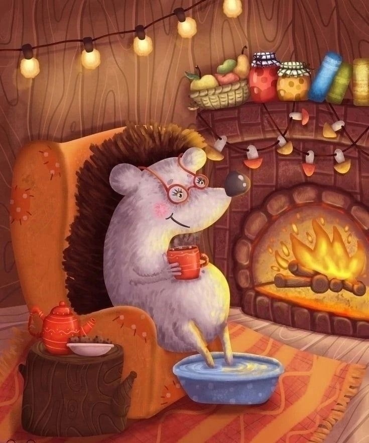 На изображении показан мультяшный ежик, сидящий в уютном помещении. Ежик уютно устроился в большом мягком кресле оранжевого цвета с узорами, на нем круглые очки, а в лапках кружка чая. Перед ним уютно потрескивает камин, отбрасывающий теплое оранжевое свечение. На каминной полке стоят банки с вареньем и корзина с фруктами. Пол застелен ковром с оранжевыми и красными полосами, придающими дополнительное ощущение уюта. Ежик опустил лапы в миску с теплой водой, наслаждаясь домашним теплом. Над камином свисают гирлянды из лампочек, создающих дополнительное освещение. Вся обстановка говорит о том, что здесь царит комфорт и спокойствие, несмотря на возможные ненастья за окном.