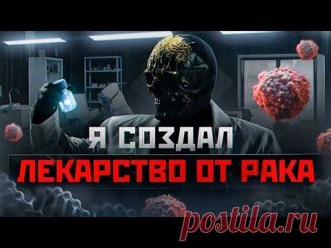 На изображении представлена сцена в научной лаборатории, где фигура в белом халате держит в руке пробирку с неизвестным раствором. Лицо фигуры закрыто маской, создающей зловещую атмосферу. Текст на переднем плане гласит: "Я создал лекарство от рака", что придаёт изображению элемент драматизма и интриги. Вокруг фигуры левитируют клетки, напоминающие вирус или бактерии. На заднем плане видны лабораторные столы и оборудование, что усиливает научный антураж. Окружение темное, с приглушенным светом, создающим напряженное настроение, подчёркнутое ярким свечением пробирки в руке фигуры. В правом нижнем углу написано "postila.ru".