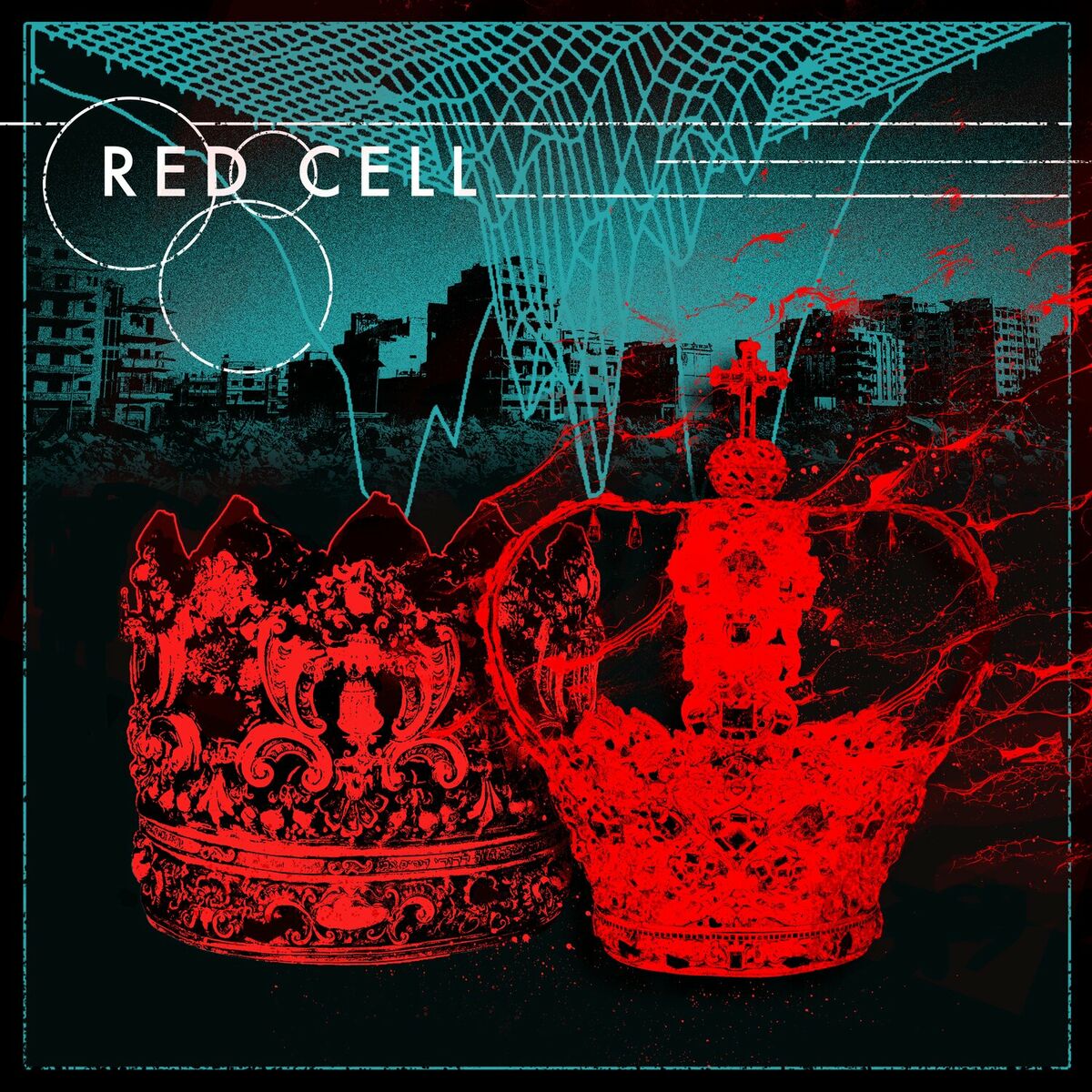 На изображении представлена обложка музыкального сингла группы Red Cell под названием "King and Queen in Ghost Town". Композиция датируется 2025 годом. Центральное место занимает изображение двух великолепных корон, выполненных в насыщенном красном цвете. Сзади можно увидеть силуэты заброшенных зданий, что создает атмосферу заброшенного города. Все элементы обложки переплетаются с геометрическими сетками светло-голубого оттенка, которые напоминают абстрактную карту или научную диаграмму, подчеркивающую современный и загадочный стиль композиции. Над коронами вдоль верхней части изображения написано название группы "Red Cell" белыми буквами. Так жилищно-графическая композиция выражает идею одиночества и величия среди руин, придавая синглу некий философский и драматический смысл.