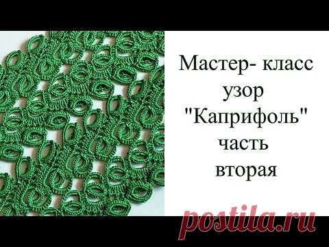 Изображение демонстрирует сложный вязаный узор из зеленого кружева, выполненного техникой ленточного вязания. Узор называется "Каприфоль", что указывает на декоративный и изысканный характер работы. Кружево имеет витиеватую структуру, в которой зелёные нити переплетаются, создавая декоративные петли и узоры. На фоне виден текст, объясняющий, что это вторая часть мастер-класса по соединению лент. Атмосфера изображения сосредоточена на рукоделии и искусстве вязания, что может вдохновить любителей и профессионалов этого ремесла. Светлое и приятное оформление подчёркивает изысканность работы, а чёткая контрастность текста делает его легко читаемым.