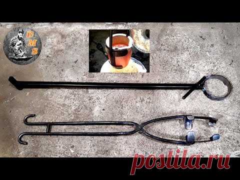 На изображении представлены инструменты, используемые в литейном производстве. На сером, текстурированном бетонном полу лежат два главных объекта: пара черных литейных щипцов и длинный металлический стержень с креплением в виде кольца на одном из концов. Щипцы имеют два крюка на концах и выглядят тяжелыми, предназначенными для перемещения горячих материалов. Справа в левом верхнем углу изображена цветная вставка, на которой видно, как из печи извлекается раскаленный красный металл в специиальной емкости. Логотип "DMS" и подпись "postila.ru" находятся в углах изображения. Атмосфера работы, требующая предельной осторожности и внимания, подчеркивается общим темно-серым фоном.