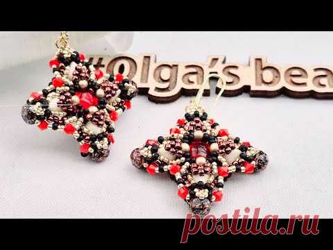 На изображении представлены изящные серьги, выполненные в виде сложных геометрических узоров из различных бусин. Одна серьга находится на переднем плане, другая чуть позади, обе размещены на светлой поверхности. Основные цвета украшений — насыщенно-красный, черный и кремовый, что придаёт серёжкам элегантный и утончённый вид. Серьги выполнены в форме креста, с центральной бусиной бордового цвета, окруженной более мелкими круглыми бусинами, что создаёт объемный и многослойный эффект. Крепления украшений золотистого цвета придают дополнительный шарм и делают аксессуар заметным. Фоном служит декоративная надпись «#Olga"s beauty», вырезанная из светлого дерева. В нижней части изображения расположен логотип сайта «postila.ru»..
