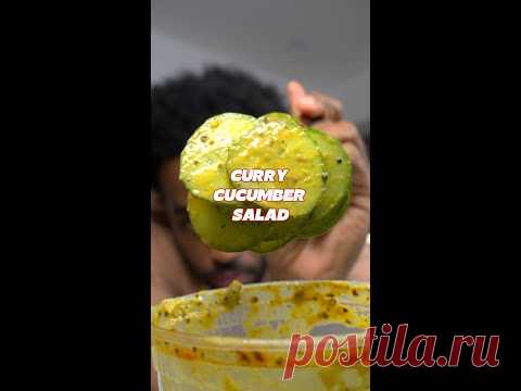 На изображении крупным планом изображены ломтики огурца, покрытые приправой карри, которые удерживает человек. Ломтики огурца имеют насыщенный зеленый цвет, с аппетитной текстурой и блеском, характерным для свежих овощей, покрытых пастой или соусом. На переднем плане видно пластиковый контейнер с остатками ярко-жёлтой приправы, предположительно карри, что создаёт насыщенный и яркий визуальный контраст. Вокруг ломтиков на изображении виден текст "Curry Cucumber Salad". Вероятно, эта надпись указывает на название блюда, которое демонстрируется на фотографии. На заднем плане размыто виден человек, держащий ломтики, хотя его лицо не в фокусе, предвещая внимание только на продукте и созданной салате. Атмосфера создается яркая и гастрономическая, вызывая желание попробовать и ощущение свежести.