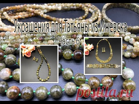 На изображении представлены украшения из бисера и камней. На тёмном фоне расположены несколько ниток бус разного размера и оттенка, включая зелёные, коричневые и золотистые бусы. Над надписью "Украшения для Татьяны из Ижевска" расположены два отдельных фрагмента с более детальными изображениями украшений. Первый фрагмент содержит бусы с добавлением роз, а второй показывает комплект с колье и браслетом. Атмосфера изображения создаёт ощущение элегантности и мастерства ручной работы. Бусы аккуратно выложены, чтобы продемонстрировать их фактуру и цвет. Логотип "postila.ru" размещается в нижнем правом углу, указывая источник изображения.