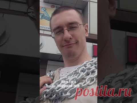 На изображении изображён человек в очках, одетый в светлую одежду, поверх которой надета массивная металлическая цепь. Он стоит на улице на фоне здания, на котором можно разглядеть рекламный плакат с изображением зелёного объекта. Человек улыбается и слегка прищурился, а в правом нижнем углу виден водяной знак с надписью "postila.ru", что указывает на источник изображения. В нижней части фото присутствует текст, который явно добавлен поверх изображения и гласит: "Теперь у него в подчинении люди". Атмосфера снимка характеризуется легкостью и юмором, так как цепи ассоциируются с силой или властью, однако, в сочетании с улыбкой молодого человека, создается ироничный контраст. Задний план слегка размытый, детали здания не слишком четкие, что позволяет сосредоточиться на главном предмете фото – молодом человеке в цепях.