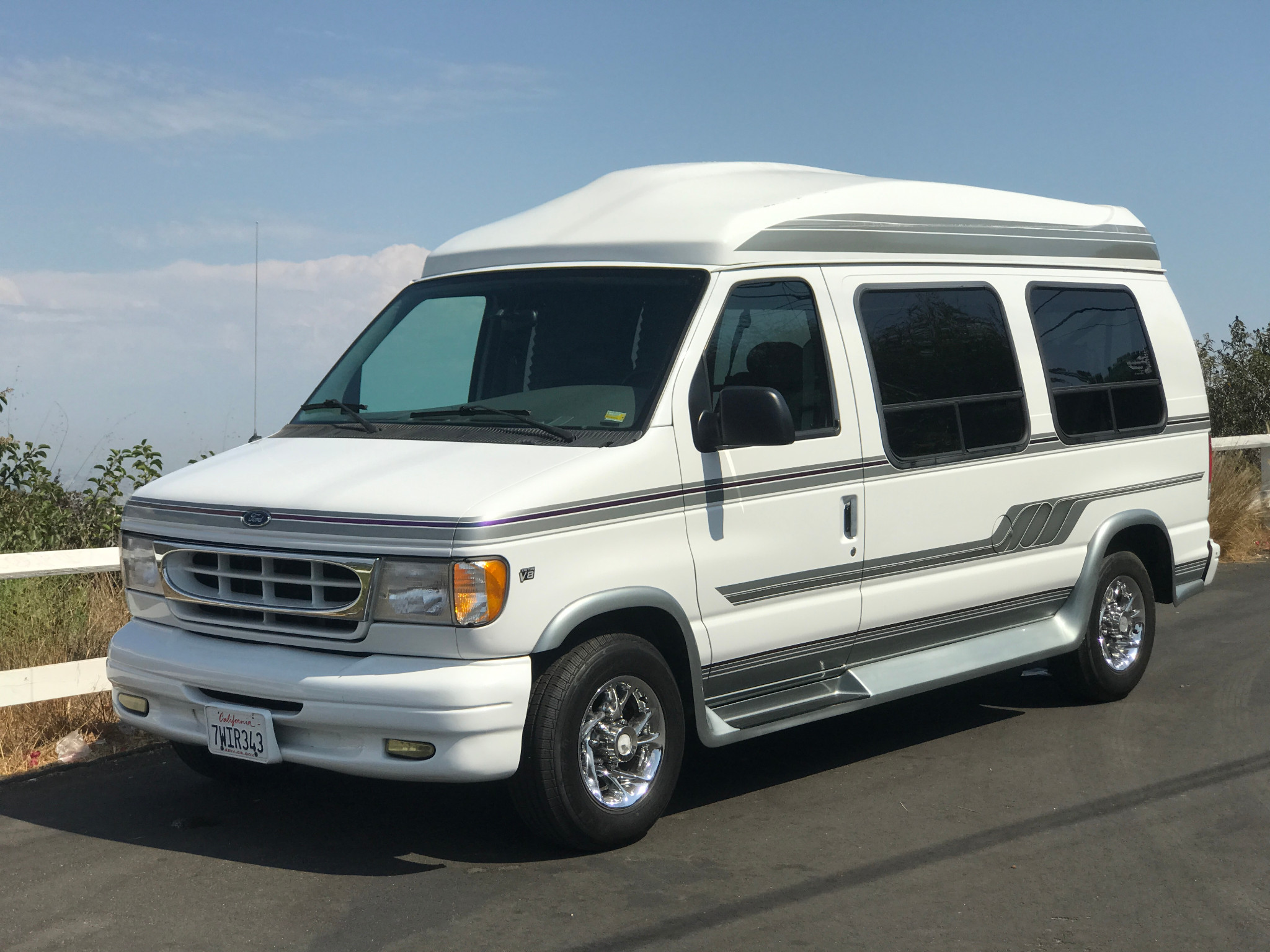 Изображение демонстрирует белый фургон марки Ford, модель Econoline, стоящий на асфальтированной дороге. Автомобиль имеет характерный удлинённый кузов и высокий потолок, что свидетельствует о его модификации для максимальной вместимости и комфорта. Передняя часть автомобиля оснащена хромированной решеткой радиатора и большими прямоугольными фарами. По бокам видны большие тонированные окна, придающие фургону современный вид. Фургон в хорошем состоянии, без видимых повреждений кузова. Номера машины указывают на регистрацию в Калифорнии, США. На заднем плане можно увидеть деревянное ограждение и редкую растительность, что говорит о пригородной местности, возможно, неподалеку от побережья, судя по ясному небу и хорошей погоде.