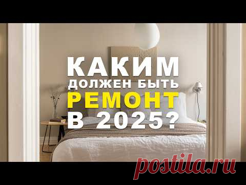 Изображение демонстрирует современную спальню с минималистичным дизайном. В центре кадра находится большая двуспальная кровать, застеленная белым постельным бельем и светло-коричневым пледом. В комнате присутствуют светло-бежевые стены, которые придают помещению уют и тепло. По бокам кровати расположены прикроватные тумбочки с настольными лампами, что добавляет симметрии и гармонии в обстановку. На переднем плане видно текст на русском языке: "КАКИМ ДОЛЖЕН БЫТЬ РЕМОНТ В 2025?", причем слово "РЕМОНТ" выделено желтым цветом, акцентируя внимание на главной тематике изображения. Отсутствие лишних деталей и нейтральная палитра создают атмосферу покоя и современности, сохраняя при этом функциональность пространства.