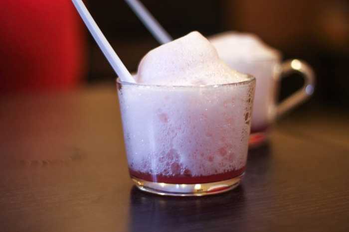 На изображении присутствует два стеклянных стакана, в которых содержится розовый пенистый напиток. Передний план доминирует прозрачная кружка с коктейлем, который перемещается из красноватого слоя жидкости в объемную пену, заполненную пузырьками. Внутри напитка погружена белая пластиковая трубочка. Второй стакан стоит на заднем плане, слегка размытый, но имеющий аналогичное содержание. Освещение создает атмосферу уюта и расслабленности, подчеркивая текстуру напитка. На заднем фоне различных оттенков коричневого и красного, который добавляет теплоты изображению. Логотип "postila.ru" размещен в нижнем правом углу изображения.
