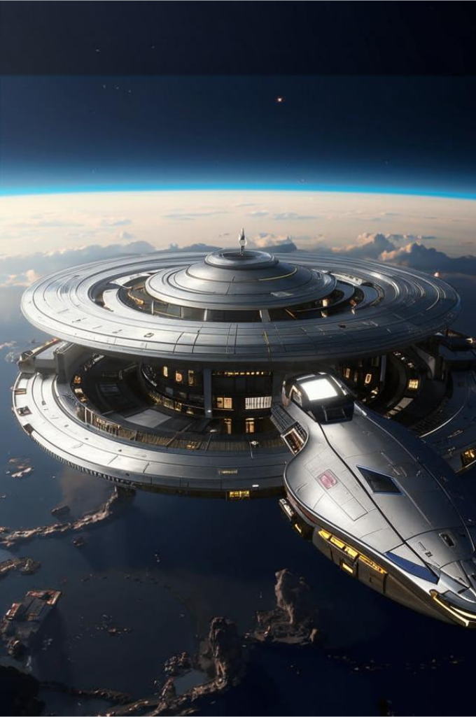 На этом изображении представлена впечатляющая сцена космической станции, парящей над поверхностью планеты. Станция имеет округлую форму, ее конструкция напоминает огромный многослойный диск, состоящий из нескольких концентрических колец. Металлическая поверхность сияет металлическим блеском, отражая свет далеких звезд и солнца. Станция оборудована многочисленными иллюминаторами и осветительными элементами, что придает ей высокотехнологичный облик. На переднем плане можно разглядеть космический корабль с острыми очертаниями корпуса, который явно идет на стыковку со станцией. Вдалеке заметны небесные тела и облачные слои атмосферы планеты, создающие ощущение глубины и бескрайности космоса. Атмосфера изображаемого пространства кажется умиротворенной, но одновременно внушает чувство величия и технологического превосходства. Нас окружает фантастический космос, где будущее человеческих путешествий обретает форму.