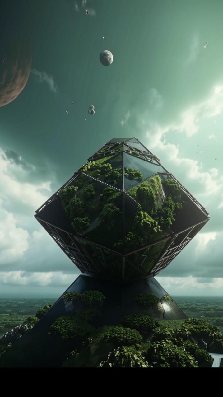 На изображении представлен футуристический пейзаж с огромным многогранным сооружением, напоминающим геодезический купол, поверх которого располагается растительность, придающая ему вид парника или биосферы. Цвет купола темно-серый, а растения имеют насыщенный зеленый цвет, что создает контраст и вносит элементы природы в эту технологичную структуру. Купол установлен на массивном основании, в то время как на заднем плане виден обширный ландшафт с полями и облаками, движущимися по небесному горизонту. Также в небе можно заметить несколько планет или спутников, управляющих загадочной атмосферой происходящего. Эти небесные тела создают впечатление места, находящегося вдали от Земли, возможно, на другой планете или в фантастическом мире. Свет, падающий на купол и растения, придает изображению драматический вид, создавая игру теней и подчеркивая выразительность всей композиции.