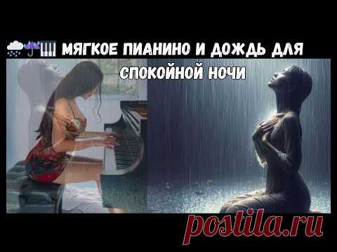 На изображении представлена композиция, разделенная на две части. Слева изображена женщина с длинными темными волосами, сидящая у пианино. Она одета в яркое платье с цветочным узором, создавая атмосферу уюта и домашнего комфорта. Видно, что женщина сосредоточена на исполнении музыки, что символизирует спокойствие и расслабление. Справа изображена женщина под проливным дождем. Вода окружает её, создавая впечатление свежести и очищения. Женщина стоит с закрытыми глазами и поднятым лицом, погруженная в атмосферу полного умиротворения и единства с природой. На изображении сверху надпись: "Мягкое пианино и дождь для спокойной ночи", что добавляет контекста успокаивающего и расслабляющего эффекта изображения. Фон обоих изображений контрастирует: светлый и тёплый тон слева, символизируя комфорт, и холодный, мокрый фон справа, символизируя освежающий природу дождь.