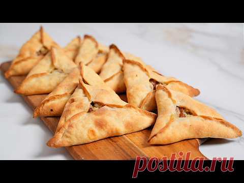 На изображении представлены аппетитные треугольные пирожки на деревянной доске. Они имеют золотисто-коричневую хрустящую корочку, которая явно говорит о том, что они были недавно испечены. Поверхность пирожков неровная, с аккуратными складками на уголках, через которые можно заметить слегка выглядывающую начинку. Начинка, вероятно, состоит из мясных или овощных ингредиентов, придающих пирожкам особую сочность и аромат. Доска, на которой расположены пирожки, сделана из тёмного дерева и прекрасно контрастирует с светлой мраморной текстурой стола в фоне. Вся композиция снимка создает уютную и теплую атмосферу, напоминающую домашние застолья и традиции. На заднем плане, размытый белый фон, привлекает все внимание к пирожкам, подчеркивая их аппетитность и мастерство приготовления.