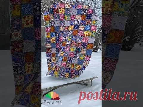 На изображении представлено красочное лоскутное одеяло, которое развевается на свежем воздухе зимой. Одеяло состоит из множества ярких квадратов, каждый из которых имеет свой уникальный рисунок и цветовую палитру, включая оттенки синего, красного, желтого и зеленого. Одеяло прикреплено на веревку и развевается на фоне снежного пейзажа. На заднем плане видны деревья с заснеженными ветвями, что подчеркивает зимнюю атмосферу. В правом нижнем углу можно заметить логотип «Dolly Stitch», а также надпись «postila.ru». В целом, изображение согревает и привлекает внимание своей красочностью и контрастом с зимней природой.