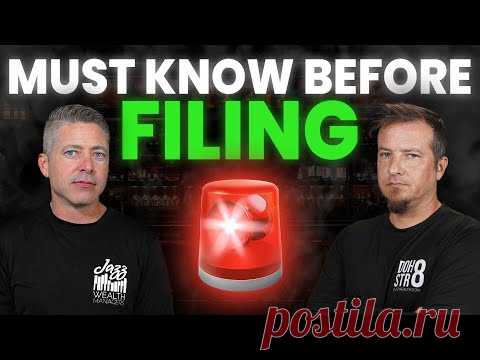 Изображение содержит двух мужчин, стоящих на фоне тёмной сцены с размытой подсветкой. Оба мужчины одеты в чёрные футболки с надписями. Текст на изображении гласит: "MUST KNOW BEFORE FILING". Между мужчинами присутствует изображение красной мигающей сирены, что добавляет важности и срочности контекста. Мужчина слева с короткими седыми волосами и надписью "Jazz Wealth" на футболке, в то время как у мужчины справа бородка, и на его футболке написано "rock STR8". Сочетание текстового и визуального контраста создаёт атмосферу настороженности и подготовленности, что привлекает внимание к необходимости быть проинформированным перед каким-то важным процессом подачи документов. Общий тон изображения серьёзный, с акцентом на информирование зрителя.