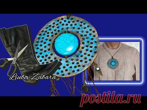 На изображении представлены несколько объектов, объединенных в коллаж. Центральное место занимает крупное круглое украшение с крупным бирюзовым камнем в центре. Внешний обод украшения имеет множество мелких отверстий, создающих уникальный узор. В левой части изображения видны кожаные черные сапоги и ножницы, что может указывать на процесс изготовления изделия, возможно ручной работы. В правой части находится человек в светлом свитере, на шее у которого висит такое же украшение, как центральное на изображении. Общий фон выполнен в темно-синих тонах, подчеркивающих яркость бирюзового камня. На изображении присутствуют надписи: "Liubov Zabara" и "postila.ru", что может указывать на авторство или источник контента. Коллаж создает ощущение художественного процесса, объединяющего моду и ремесло.