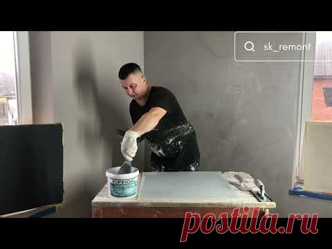 На изображении запечатлен мужчина, занимающийся ремонтом, работающий в комнате с серыми стенами. Он одет в черную футболку и защищен белыми строительными перчатками. Перед ним стоит деревянный стол, на котором расположено ведро с материалом для ремонта под названием "Ferrara", из которого он аккуратно наносит содержимое на поверхность с помощью шпателя. Стены имеют стильную приглушенную цветовую палитру, создавая современное и минималистичное впечатление. Справа от него заметно оконное стекло, дающее естественный свет, который делает атмосферу помещения более теплой и приветливой. Также, в левом верхнем углу можно рассмотреть небольшую панель с надписью "sk_remont", что может быть ссылкой на аккаунт в социальных сетях или наименование строительной фирмы, занимающейся ремонтом. Общая атмосфера изображения акцентирует внимание на процессе трансформации пространства через качество и точность выполнения ремонта.